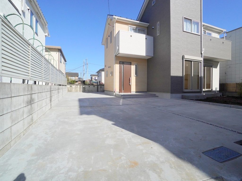 広々とした駐車スペース、南庭付きのこちらの物件。