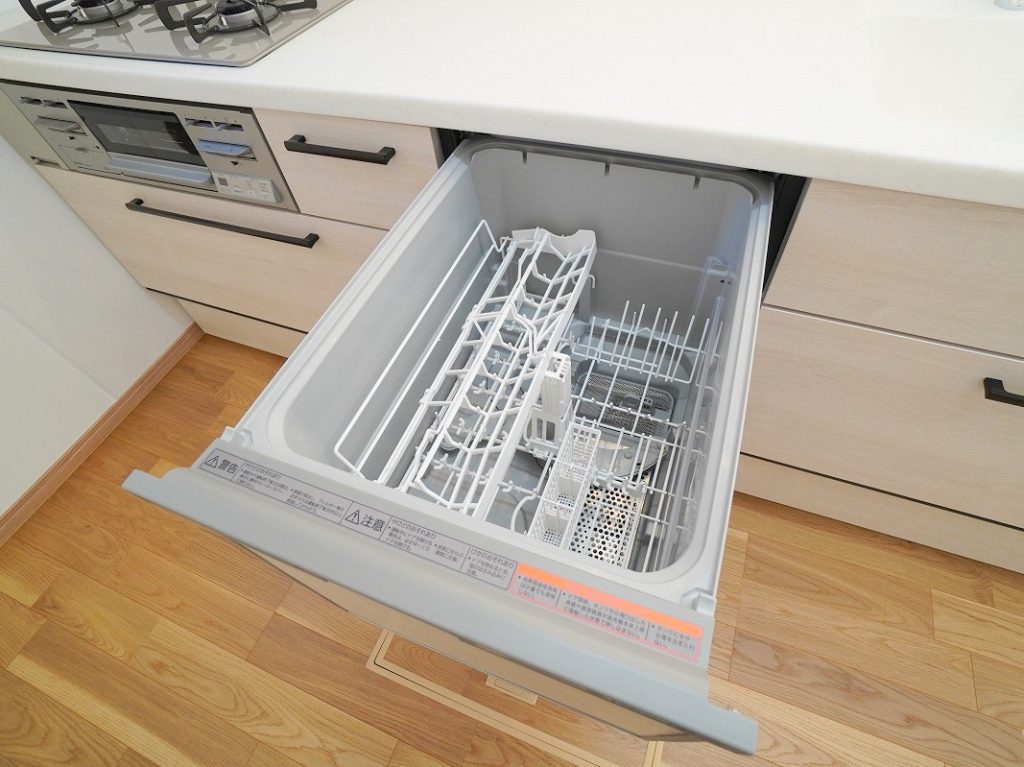 ホワイトのシステムキッチンには嬉しい食洗機付き!
