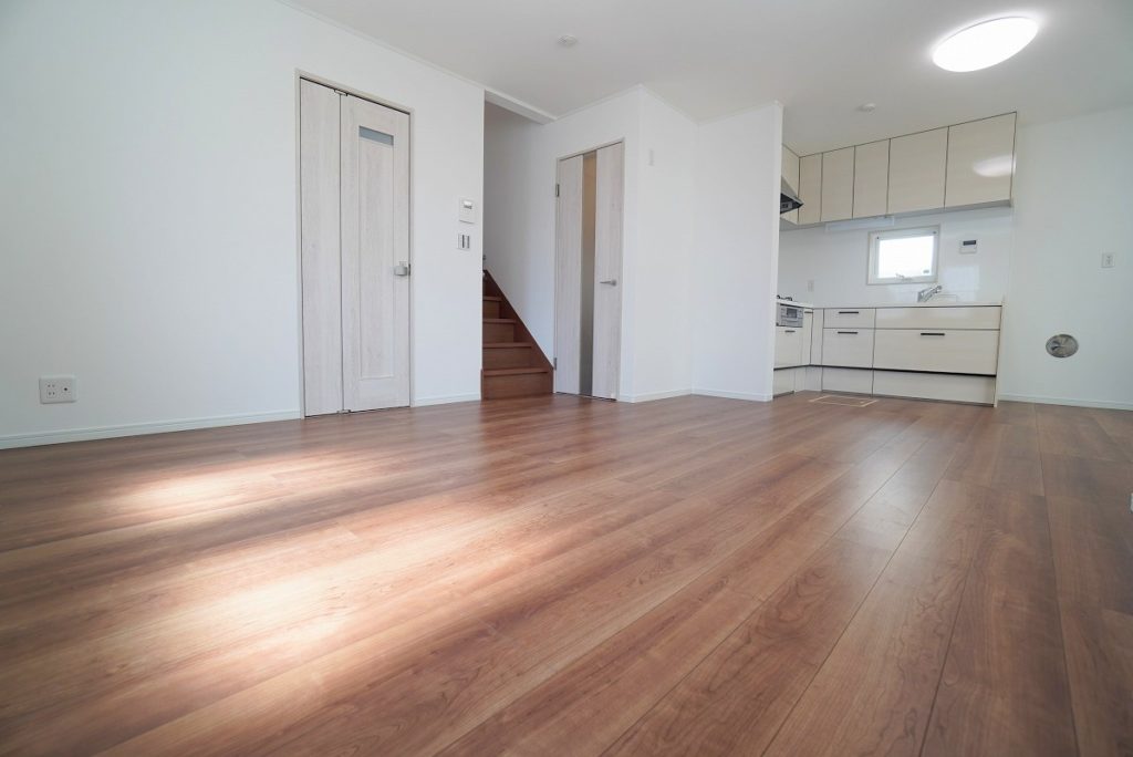 室内の様子です。LDKは14.5帖、リビング内に2階への階段がある間取りです。