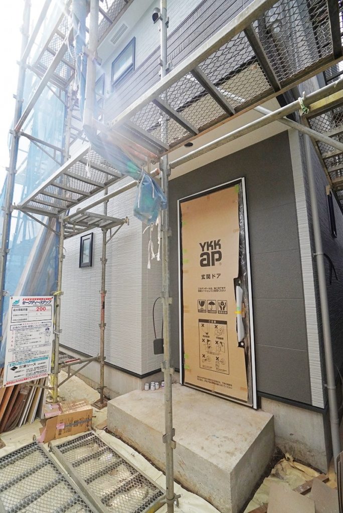 前回は残っていた玄関ドア周りもサイディングが貼られました。ここだけ色と質感を変えてアクセントを付けています✨