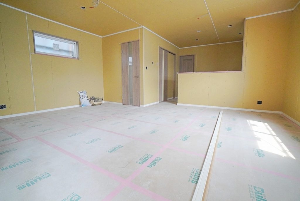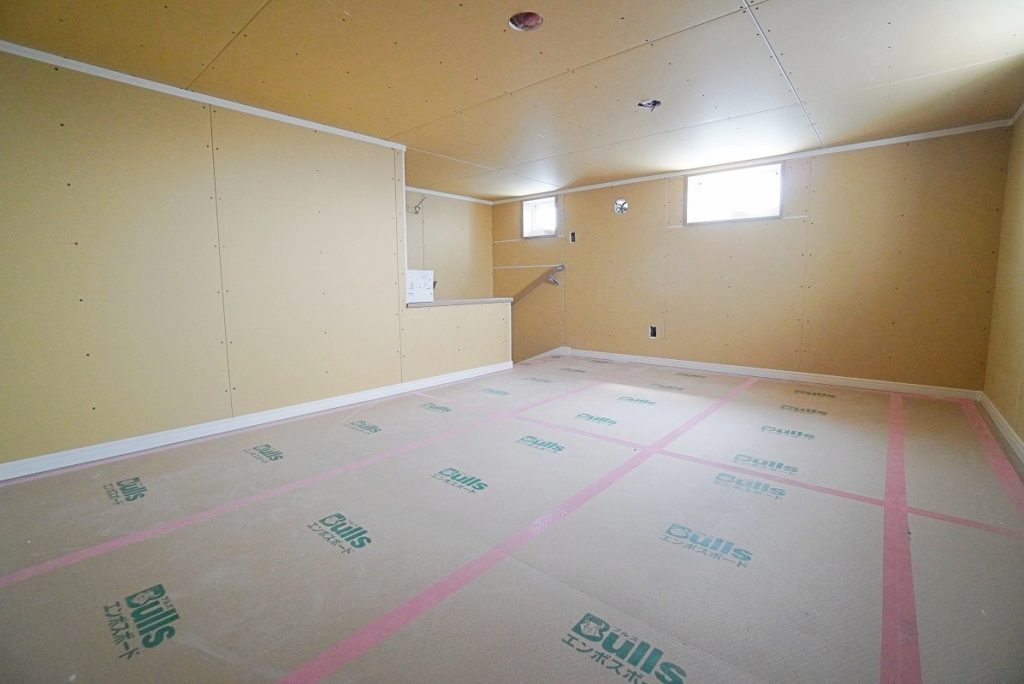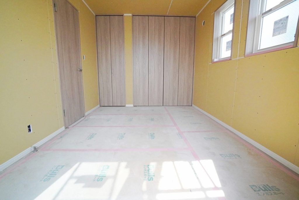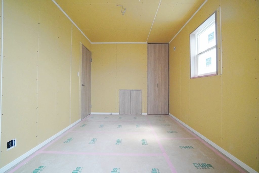 室内を見ていきましょう。壁には石膏ボードが貼られてすっかりお部屋らしくなりました。ここにクロスを貼っていきます。