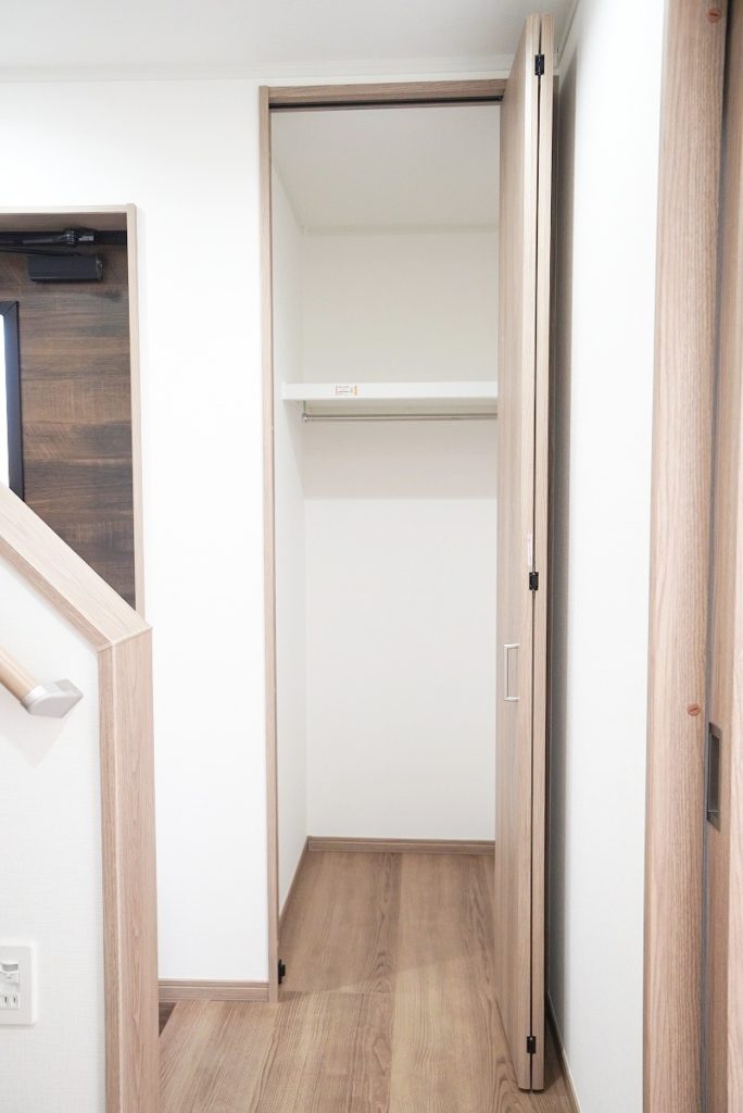 写真は玄関横に作られたクローゼット。ハンガーパイプもついているので、外出先から帰ってきた時の上着やレインコートをかけるのにとても便利です。奥行きもあるので、お子様の外遊びの道具や、スポーツ用品などをしまっておくのにも最適!もちろん、このクローゼットとは別にご家族分の靴を収納できる大容量の靴箱もついています。