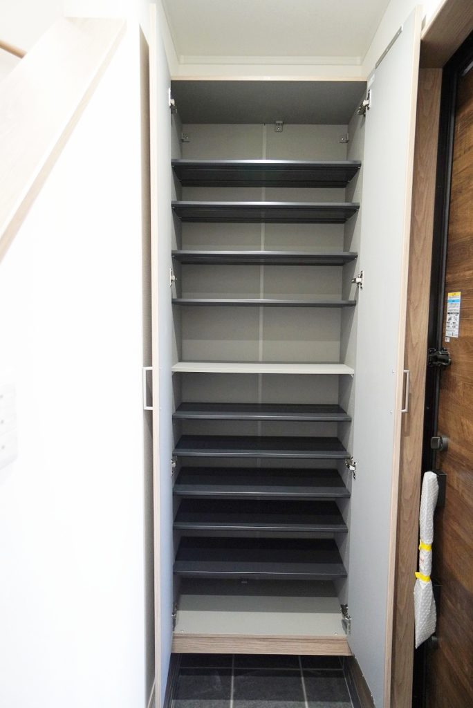 これが玄関ドアを開けてすぐのところに作られた収納です。背丈より高い大容量のシューズボックス。ご家族が多くても安心ですね。