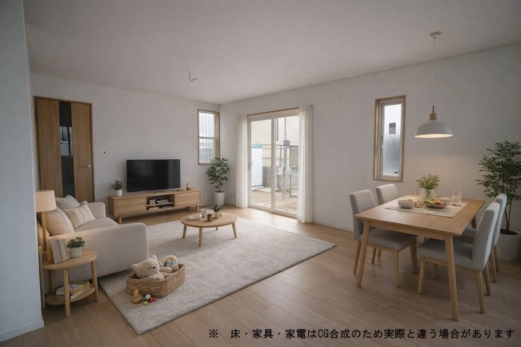 ソファとダイニングセットを置いてもまだまだ十分な広さがあるのがわかります。住んでからの生活のイメージをご想像いただけたでしょうか?