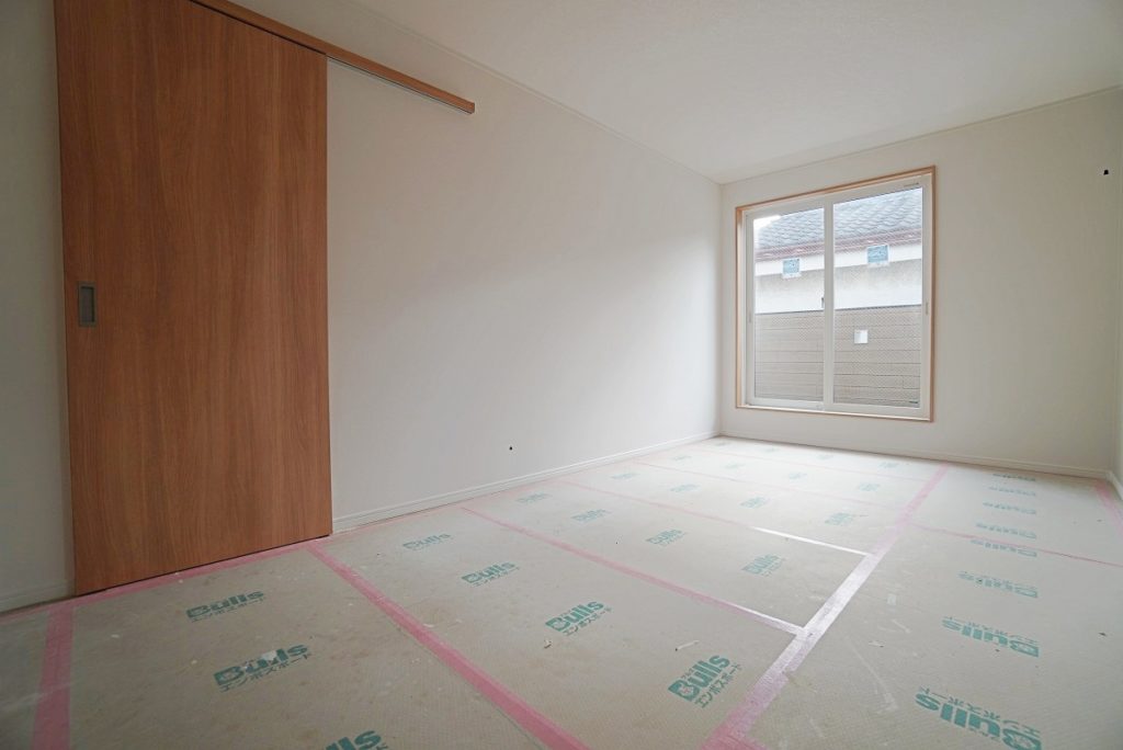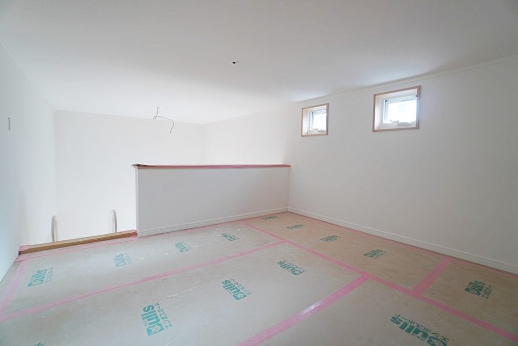 2階に上がってきました。こちらは主寝室にもお使い頂ける8.2帖の洋室です。クロスも貼り終わり、あとは照明器具を付けるだけの状態です。こちらのお部屋にはウォークインクローゼットもついていますので、荷物を片付けて、さらにお部屋を広く使って頂けます。